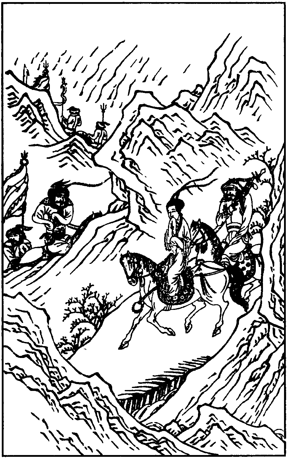 【七弟兄】说甚么大王、不当、恋王嫱,兀良,怎禁他临去也回头望!那堪这散风雪旌节影悠扬,动关山鼓角声悲壮。
