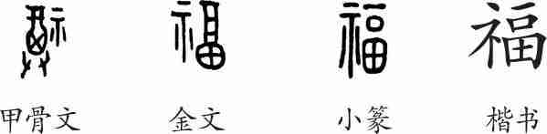 “福”是会意字。甲骨文左为祭坛,右为双手捧着酒坛之形,会拿酒祭神,祈求幸福之意。隶变后楷书写作“福”。