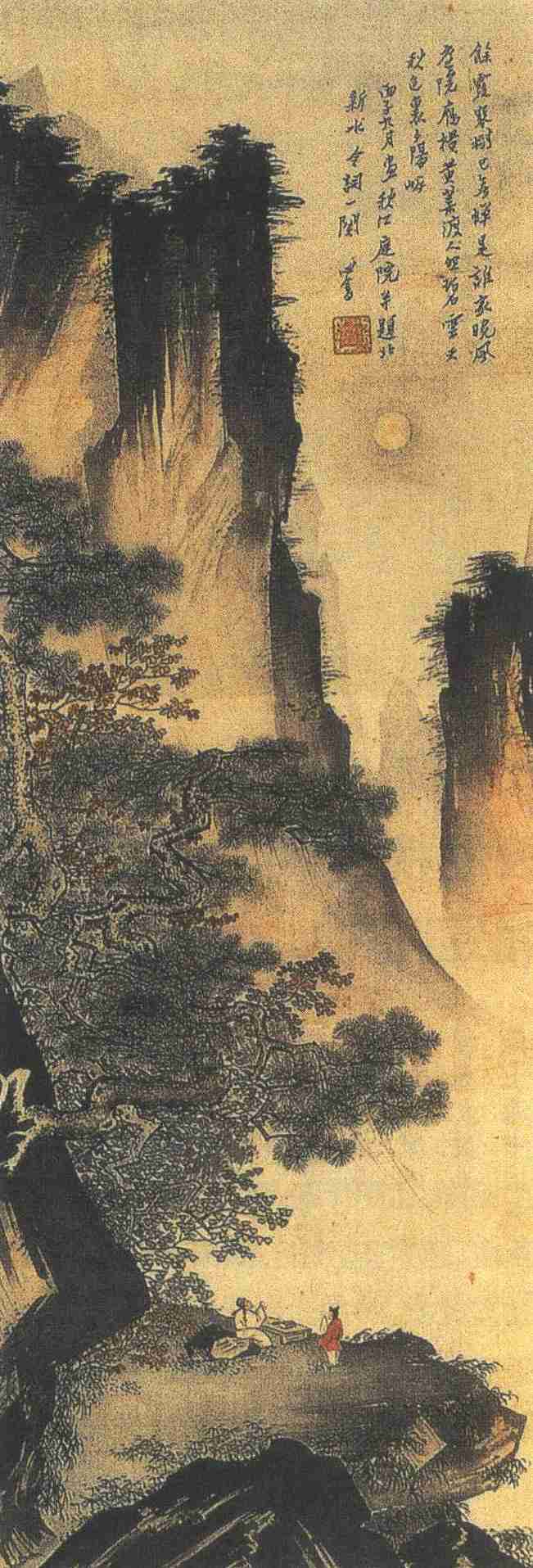自从明代董其昌提出“南北宗”论以后,山水画坛一直崇南抑北,明清而来,南宗山水“一片江南”的风尚长期占据着主流的地位,人们越来越习惯于欣赏秀丽婉约的景色,而把山水之美的另一极——坚实雄壮逐渐淡忘了。溥心畬虽然可算得上是个典型的文人,但南宋院体的水墨苍劲、一角半边的“残山剩水”,似乎更切合于他没落王孙的心境,而与平淡天真的南宗情调不无隔膜。此幅《秋江庭院图》便是颇具北宗风骨。山石俱用刚硬的大斧劈皴画成,近景的石块石壁,坚实硬朗,远处的高峰更显得挺拔伟岸,铮铮铁骨,令人肃然起敬。石壁上生有几株松树,虬枝屈伸,线条劲挺有力,顿挫之间仿佛可以看到松树顽强的生命力。虽然画面用线带面的皴法颇见硬气,但赋色却淡雅而精妙,由浅入深,层次分明,深的地方沉稳端严,浅的地方雅致清秀,文人雅士的俊秀之气洋溢其间。而不论是深是浅,颜色都是透明清丽,绝无浑浊呆滞。
