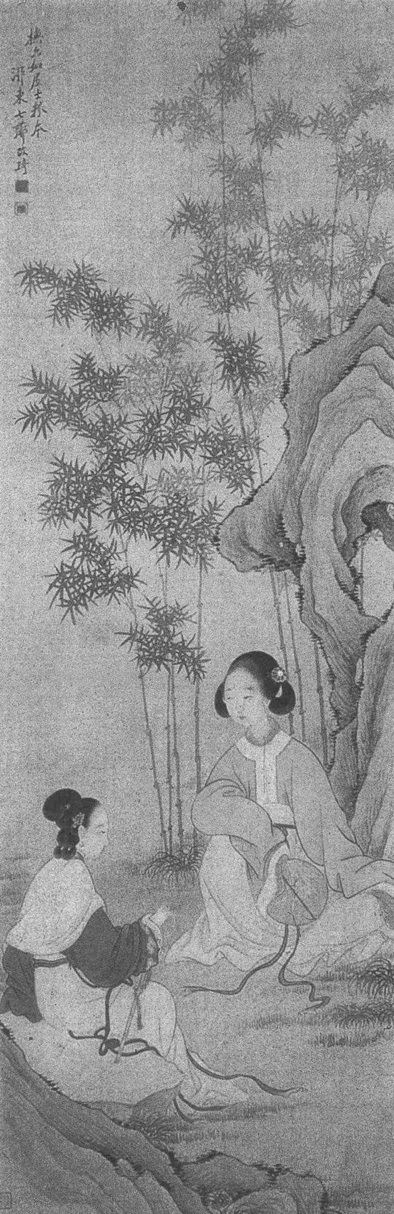 《竹下仕女图》的画面并不复杂:两女子坐在绿草青石间,背后是湖石翠竹。女子的服饰,是清代妇人的装束。画家画着时装的女子,并不为了显耀时尚,而表明此图的写实性——描写当代生活情景。“竹下仕女”的名称,是后人根据画面所定。其实,画家以竹林为配景,一是为了营造一个清幽的环境,二是以竹和其中一位青衣女士手中的竹箫相呼应,虽然表现的不是吹奏竹箫,而是两女士的喁喁细语,但我们可以作月下箫声、清风竹影的联想,画家的用意不费揣度,欣赏者有主观生发的自由。