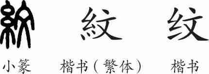 “纹”是形声兼会意字。楷书繁体写作“紋”,从糸从文会意,文兼表声。汉字简化后写作“纹”。