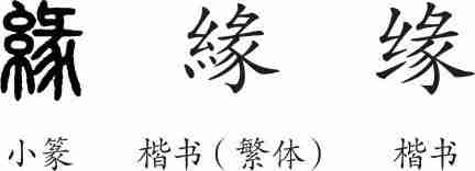 “缘”是形声字。小篆从糸(表示与丝线布帛有关),彖声。隶变后楷书写作“緣”。汉字简化后写作“缘”。