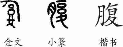 “腹”是形声兼会意字。金文从人,复声,复兼表复叠之意。小篆改为从肉,复声。隶变后楷书写作“腹”。