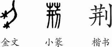 “荆”是会意兼形声字。金文从刀割草;或另加井声。小篆另加义符“艸”(艹),隶变后楷书写作“荆”,讹为从艸,刑声。