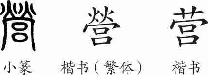 “营”是形声字。小篆从宫(原始环形穴居房屋的透视轮廓),省声。隶变后楷书写作“營”。汉字简化后写作“营”。