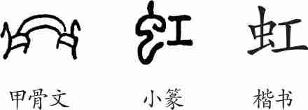 “虹”为象形字。甲骨文像雨后天上出现的长虹之形。小篆改为从虫、工声的形声字。隶变后楷书写作“虹”。