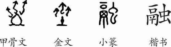 “融”是会意兼形声字。甲骨文下从土,上从蟲,会冰雪消融、春气升腾,蛰虫蠢动之意。金文大致相同。隶变后楷书写作“融”。