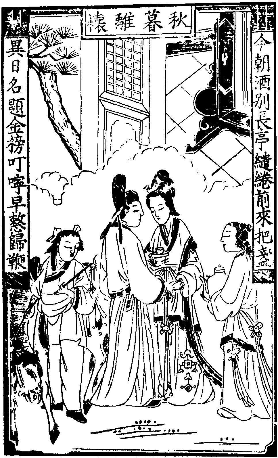 【仙吕调·恋香衾】 苒苒征尘动行陌,杯盘取次安排。三口儿连法聪,外更无别客。鱼水似夫妻正美满,被功名等闲离拆。然终须相见,奈时下难捱。君瑞啼痕污了衫袖,莺莺粉泪盈腮。一个止不定长吁,一个顿不开眉黛。君瑞道: “闺房里保重!” 莺莺道: “路途上宁耐!” 两边的心绪,一样的愁怀。