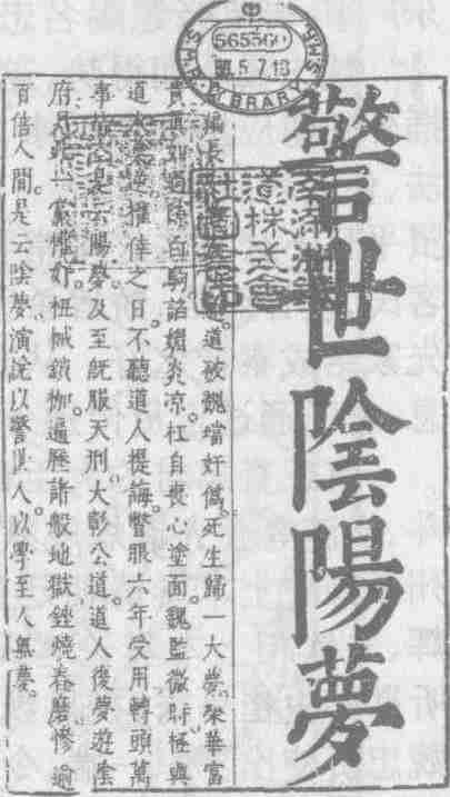 明崇祯元年(1628)刊本《警世阴阳梦》扉页书影