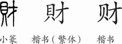 “财”是形声字。小篆从貝(表示与财物有关),才声。隶变后楷书写作“財”。汉字简化后写作“财”。